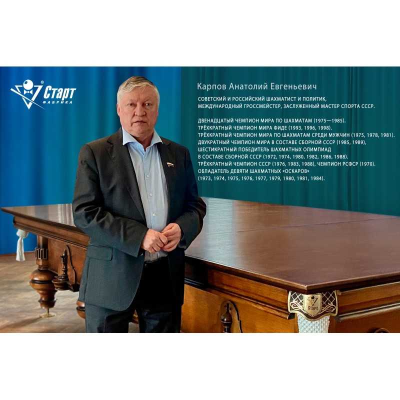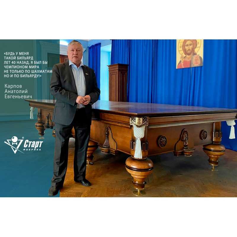 «Если бы у меня была возможность играть на таком столе лет 40 назад, я был бы чемпионом мира не только по шахматам, но и по бильярду!» - сказал Анатолий Евгеньевич. Для Фабрики «Старт» это высокая оценка. Для нас было честью работать над проектом для Великого шахматиста!