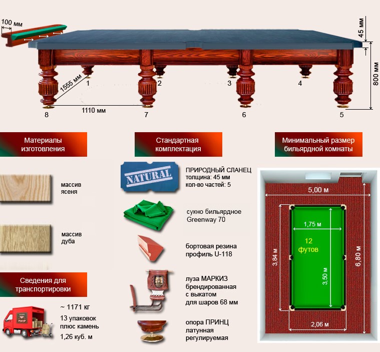 Бильярдный стол «Маркиз» компании «Руптур» — это коллекционное оборудование спортивного уровня, внешность которого призвана доставлять эстетическое удовольствие игрокам и гостям домашних турниров. Величественная стать, тонкие линии ручной резьбы — элегантное сочетание, благодаря которому «Маркиз» станет главным украшением любого помещения. Отборное дерево и камень — неподверженные влиянию времени материалы, позволяющие говорить об исключительном сроке службы изделия.