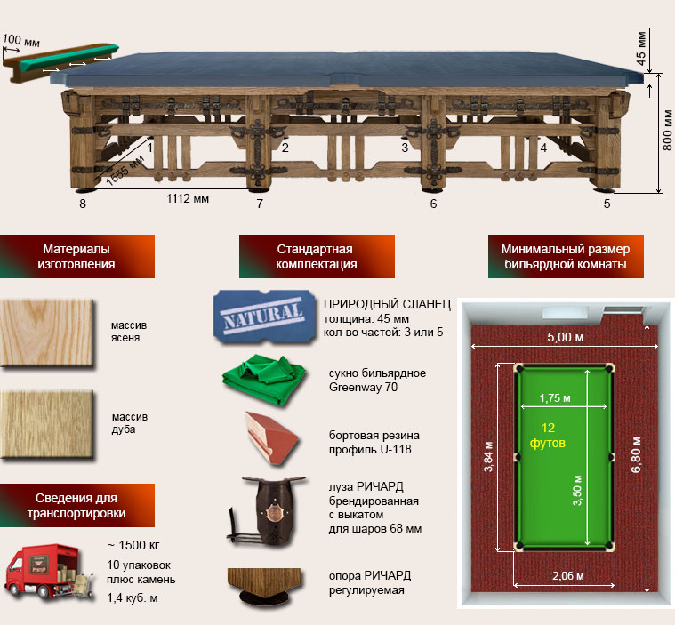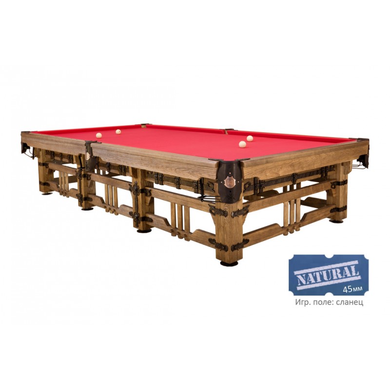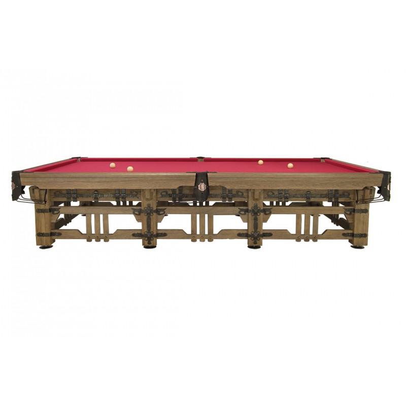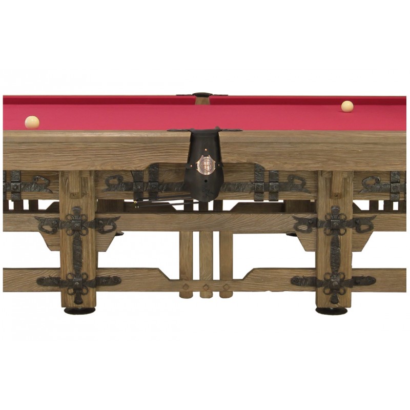 Бильярдный стол «Ричард III» — представитель коллекционной серии компании «Руптур», выполненной в традициях замковой мебели. Искусственно состаренный отборный массив дуба или ясеня придает столу эпохальный внешний вид. Кованые элементы ручной работы эффектно дополняют фактуры деревянных поверхностей и вместе с ними создают ощущение величественности.