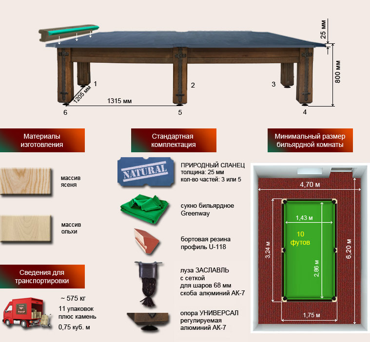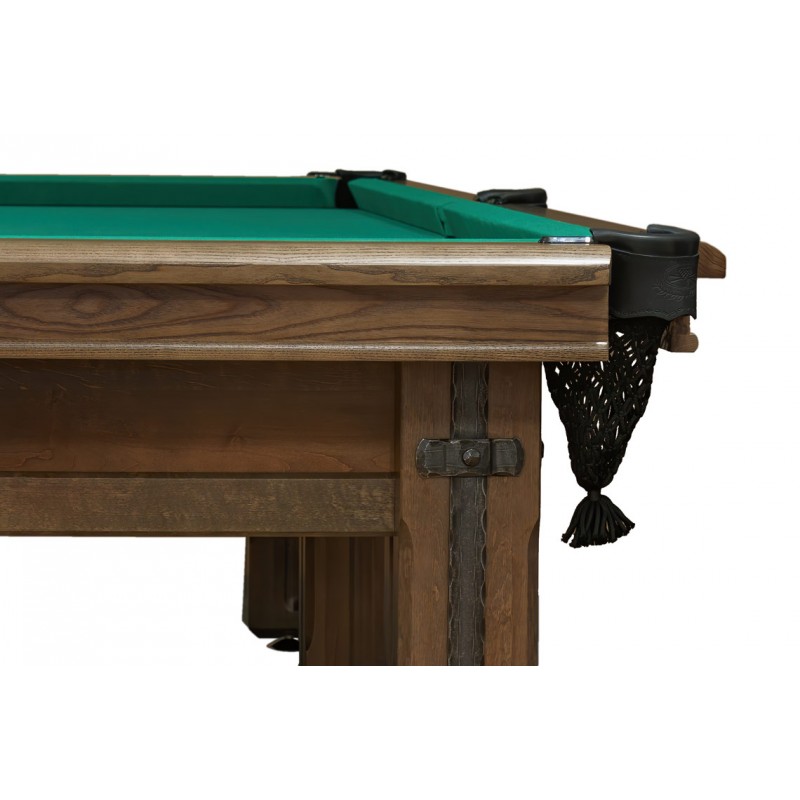 Бильярд «Камелот» по праву займет самое достойное место в доме, а также в сердцах его хозяев. Стол изготавливается из отборного массива ольхи и комплектуется плитой из натурального сланца в качестве основы игрового поля. Материалом для бортов служит ясень – особо прочная твердолиственная порода дерева, значительно увеличивающая срок службы бильярдного стола и сохраняющая его первозданную эстетику.