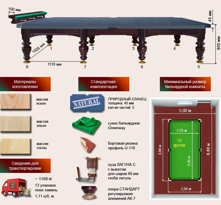 | Размер стола (футы) | 9 ФТ/10 ФТ/ 12 ФТ - на выбор |