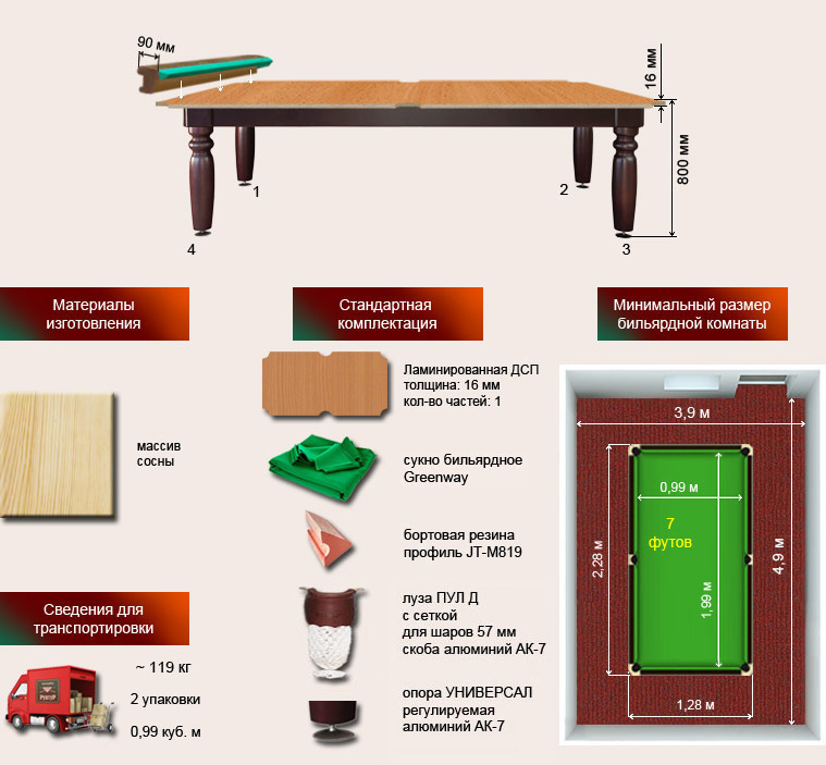 Бильярд может поставляться как в собранном, так и разобранном виде.